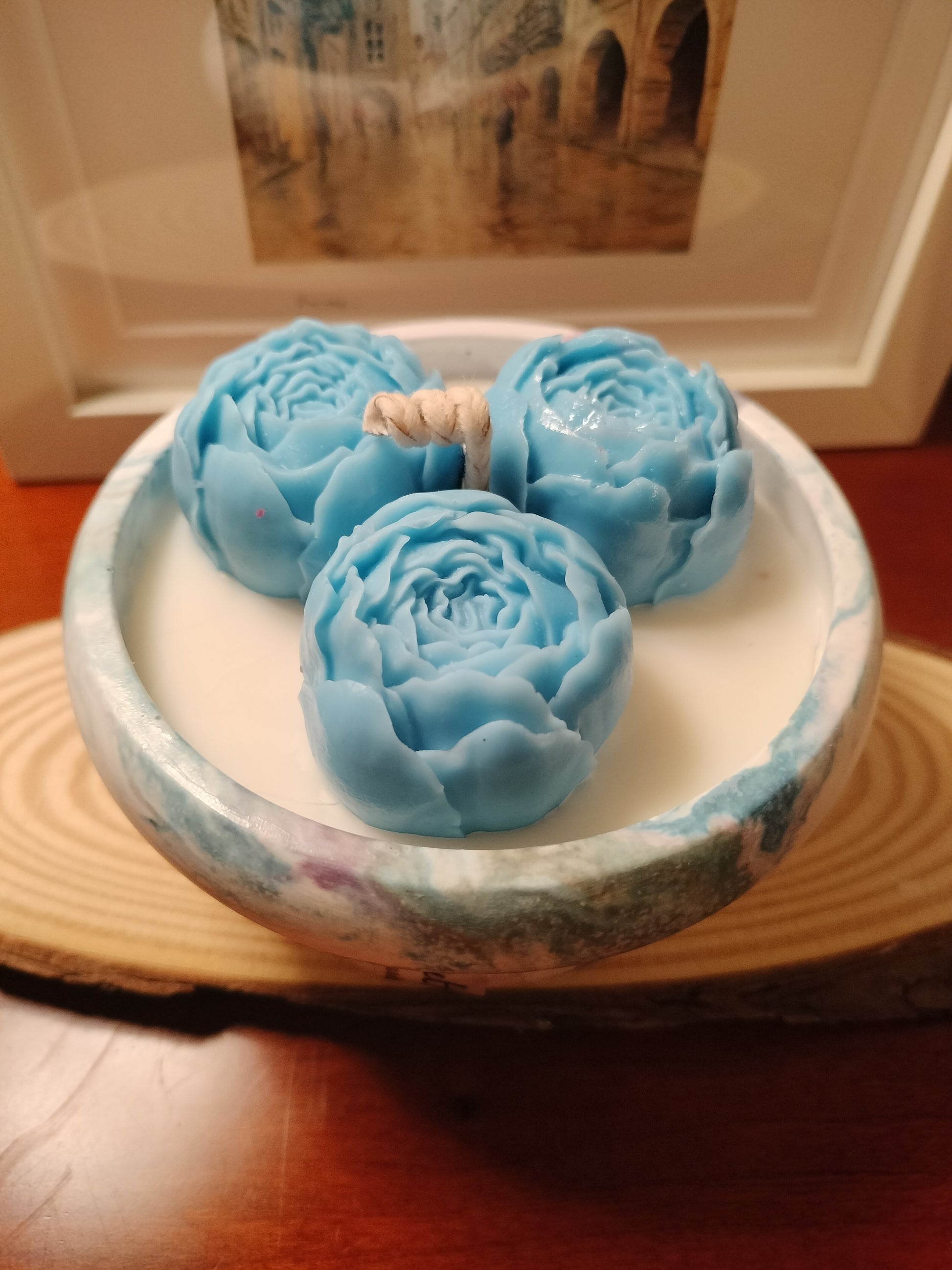 - Decoração: Trio de mini rosas de soja esculpidas.