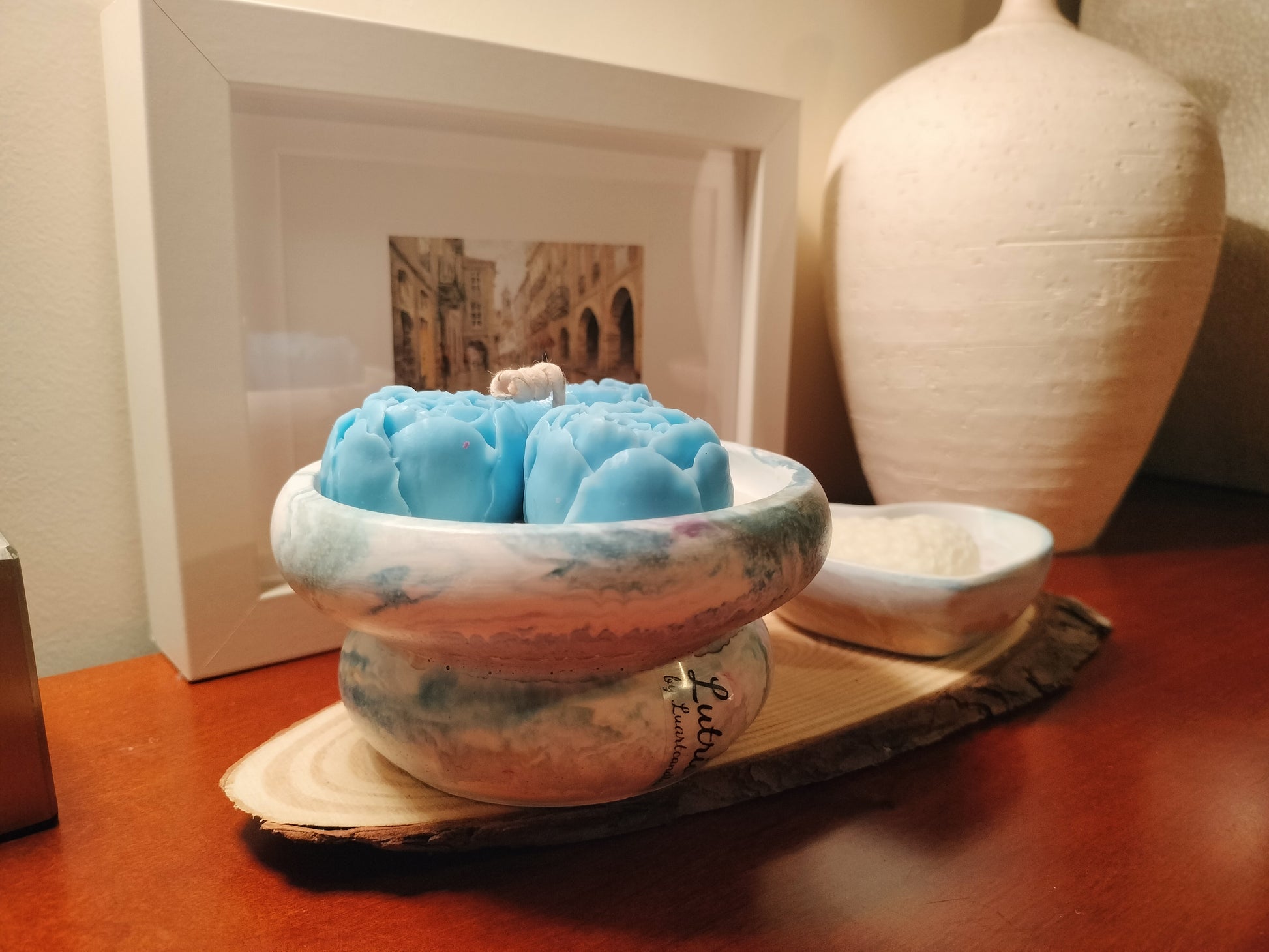 - Recipiente: Taça de cerâmica marmoreada (design exclusivo Luartcandles). Taça de 9 cm e 5 cm de altura.